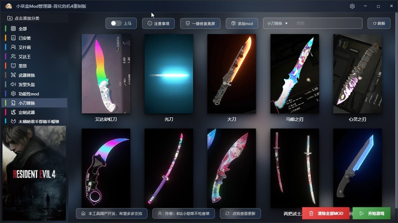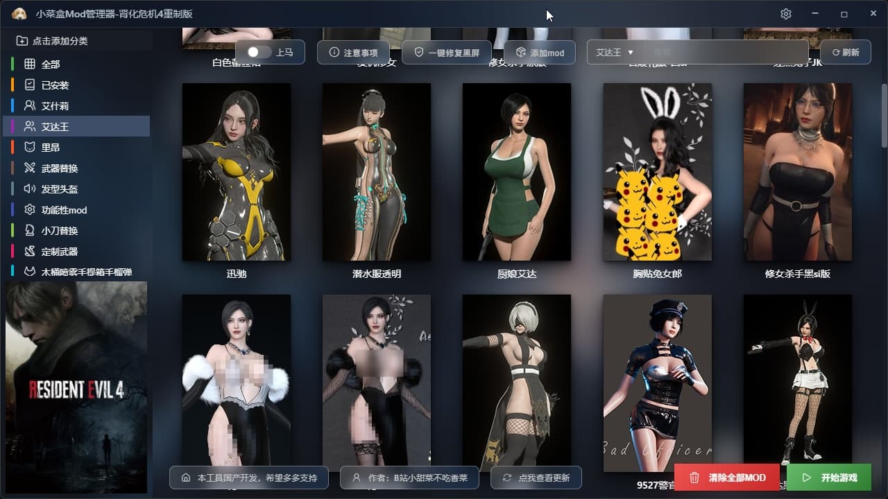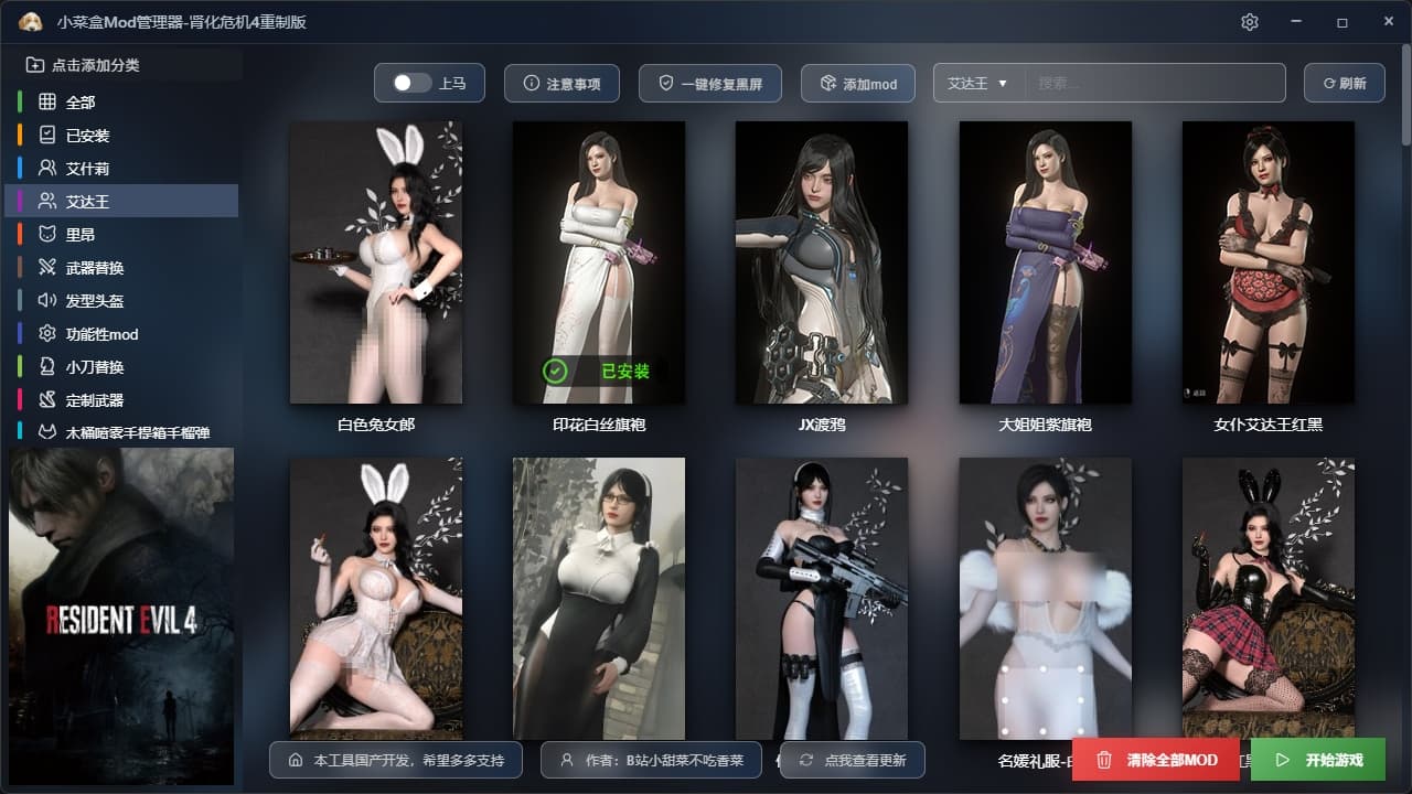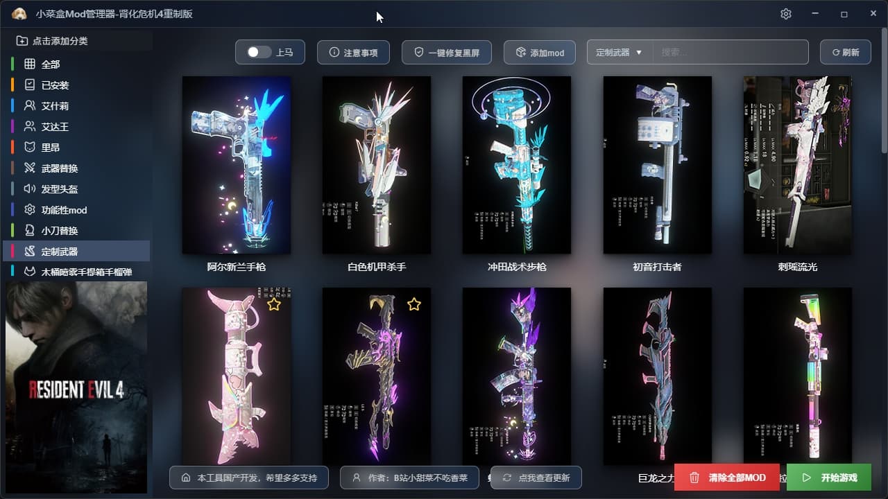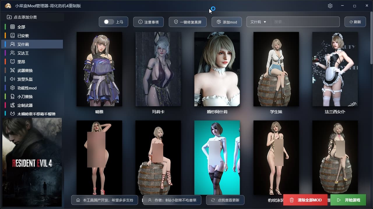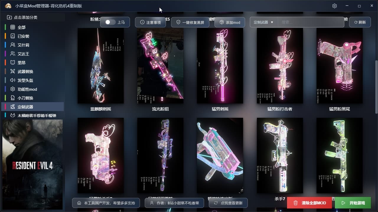 创作不易,本人也是生化迷,看到大家用mod都很麻烦,特别是安装和卸载MOD,点进去,很多很多文件夹,还全是英文对小白很不友好,看都看不懂,国内之类的软件也是一片空白,于是连忙打开电脑敲代码,保证你到手就会用,全中文国产软件,实现了每个mod都可以单独安装和卸载,点一下安装,再点一下就可以卸载!避免使用MOD冲突和很多重复的操作,。后续还会添加很多新MOD!费用是用来维护网站和租服务器费用的,包更新的哈。Mod现在230多个,都是精品Mod.解压后一共70多G的精彩内容。太多内容无法一一展示更多精彩内容等你解锁游玩