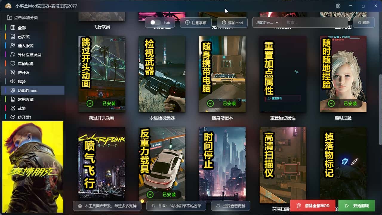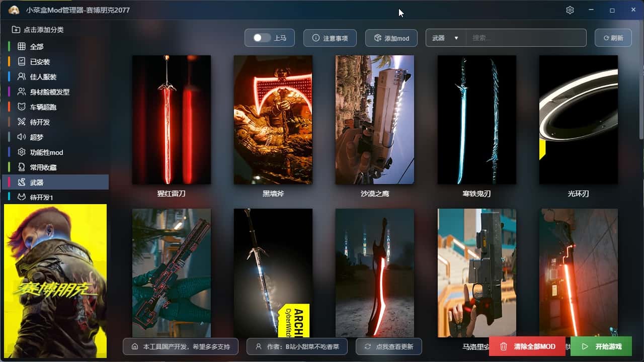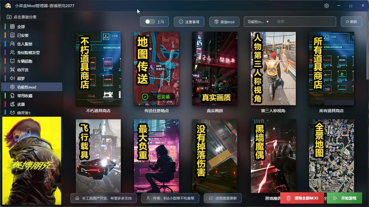 创作不易,看到大家玩赛博20077用mod都很麻烦,特别是安装和卸载MOD,很多文件夹,还全是英文对小白很不友好,看都看不懂,国内之类的软件也是一片空白,于是连忙打开电脑敲代码,保证你到手就会用,全中文国产软件,实现了mod一键安装和卸载,避免使用MOD冲突和很多重复的操作,同时也支持自行添加MOD。后续还会添加新MOD!费用是用来维护网站和租服务器费用的。本mod管理器适用于PC任何平台的游戏。包后续包更新