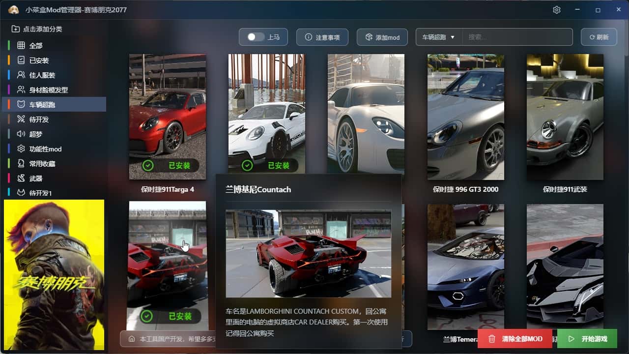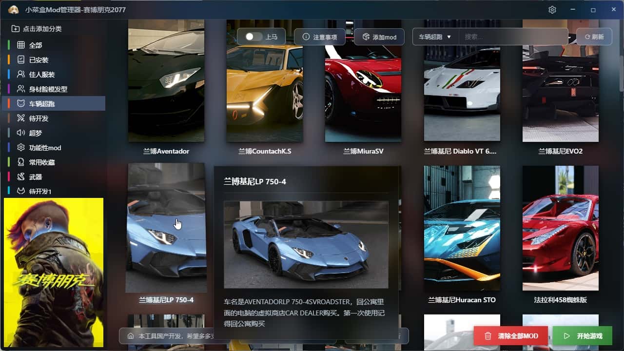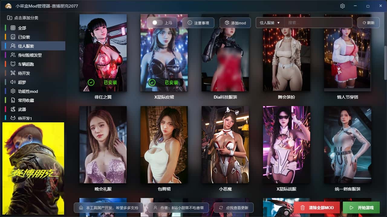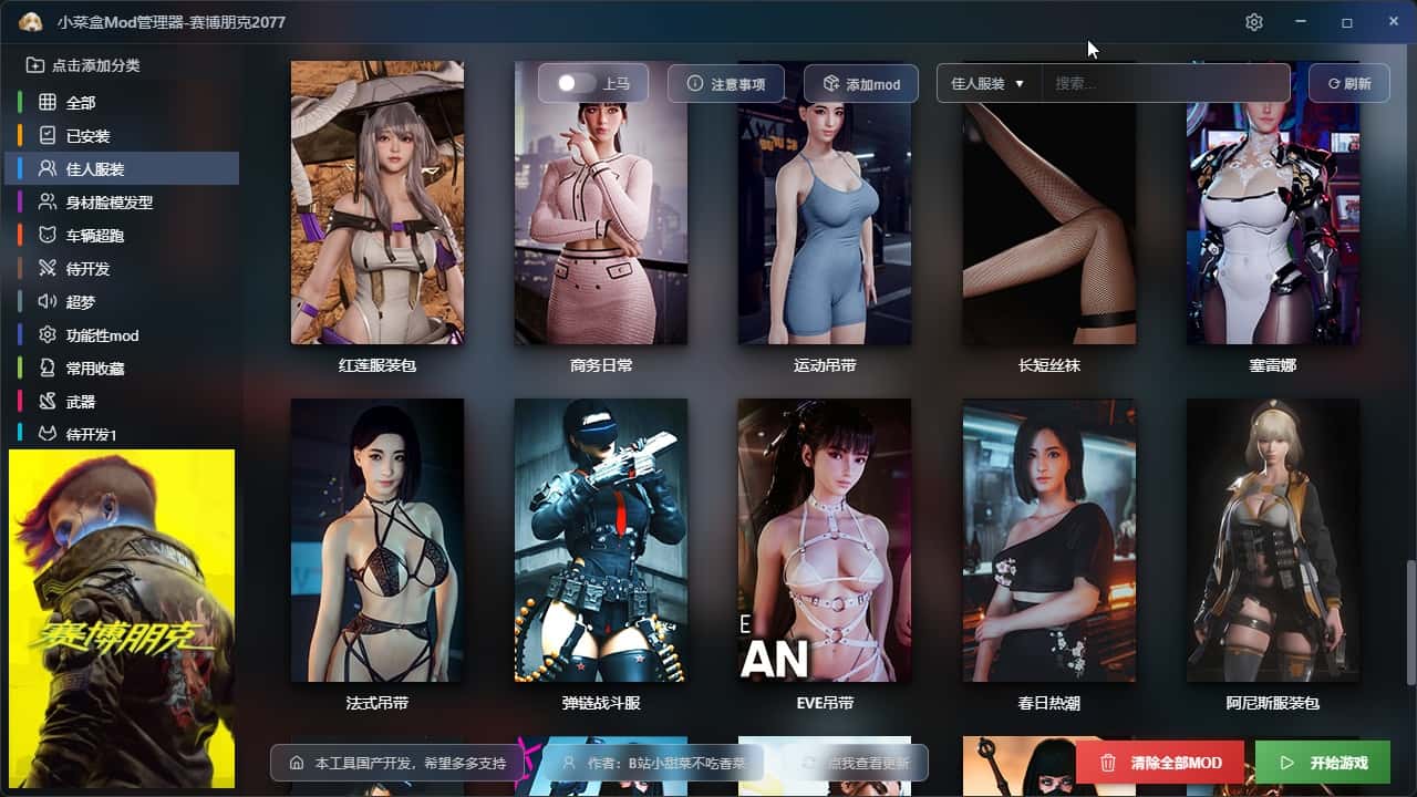 创作不易,看到大家玩赛博20077用mod都很麻烦,特别是安装和卸载MOD,很多文件夹,还全是英文对小白很不友好,看都看不懂,国内之类的软件也是一片空白,于是连忙打开电脑敲代码,保证你到手就会用,全中文国产软件,实现了mod一键安装和卸载,避免使用MOD冲突和很多重复的操作,同时也支持自行添加MOD。后续还会添加新MOD!费用是用来维护网站和租服务器费用的。本mod管理器适用于PC任何平台的游戏。包后续包更新