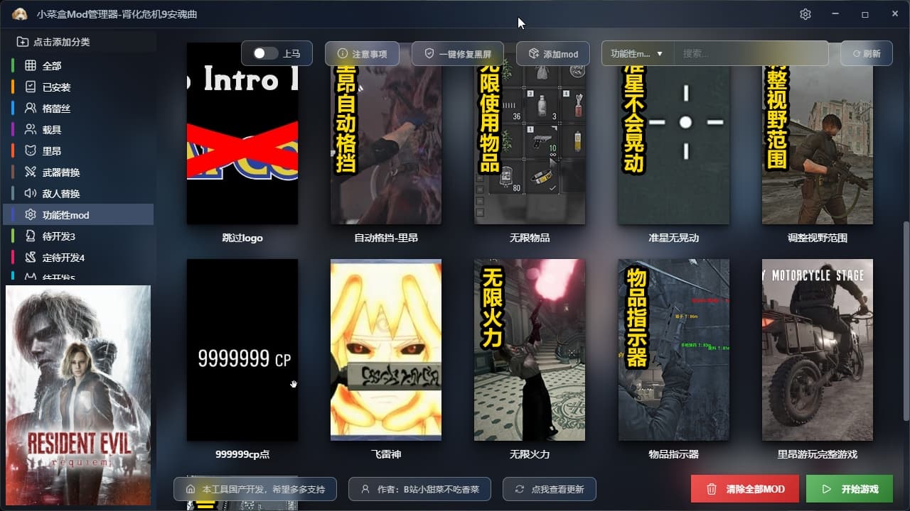 创作不易,本人也是生化迷,看到大家用mod都很麻烦,特别是安装和卸载MOD,点进去,很多很多文件夹,还全是英文对小白很不友好,看都看不懂,国内之类的软件也是一片空白,于是连忙打开电脑敲代码,保证你到手就会用,全中文国产软件,实现了每个mod都可以单独安装和卸载,点一下安装,再点一下就可以卸载!避免使用MOD冲突和很多重复的操作,。后续还会添加很多新MOD!费用是用来维护网站和租服务器费用的,包更新的哈,也支持自行添加mod。后续还会继续更新更多功能